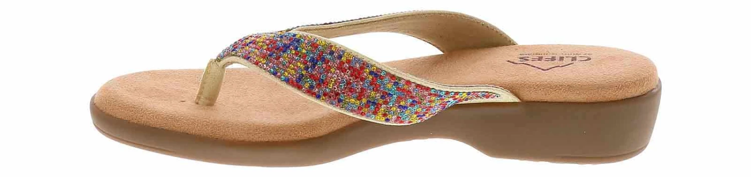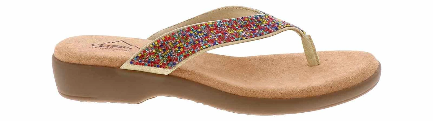 The Cliff By White Mountain Becharm Women’s Thong Sandal offers the ultimate in seamless comfort and style. Featuring a bedazzled multi-colored, flexible upper, these sandals provide a comfortable fit without compromising on fashion. With a sleek silhouette, they’re perfect for any occasion and all your getaways. Once you step into the Cliff By White Mountain Becharm Women’s Thong Sandal, you’ll never want to take them off!