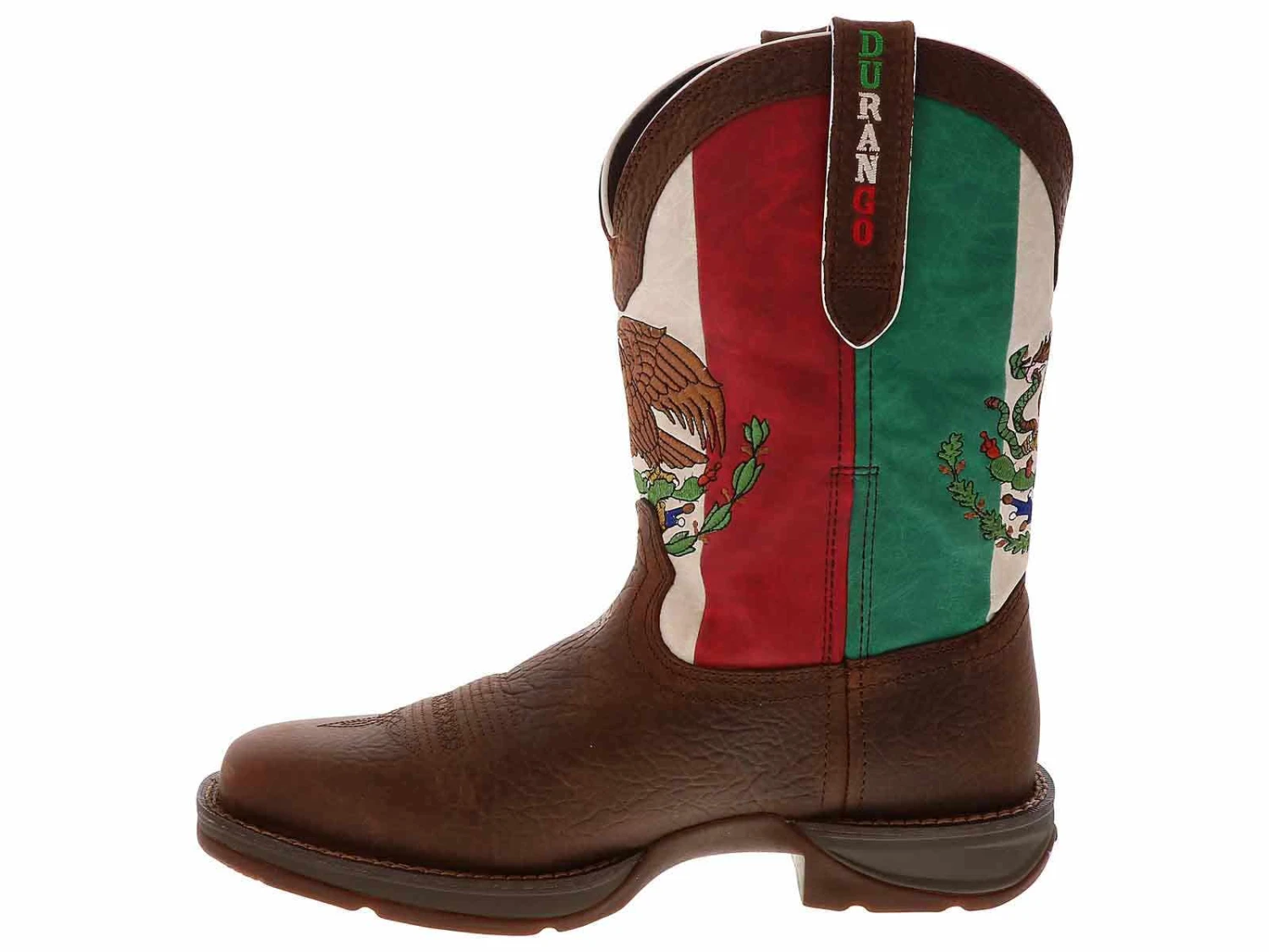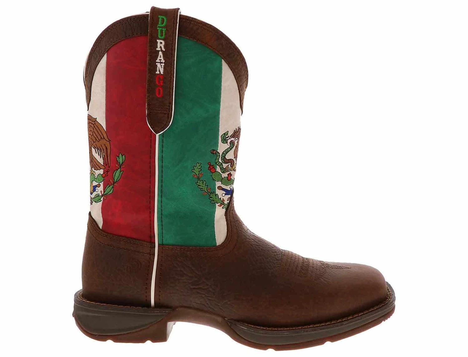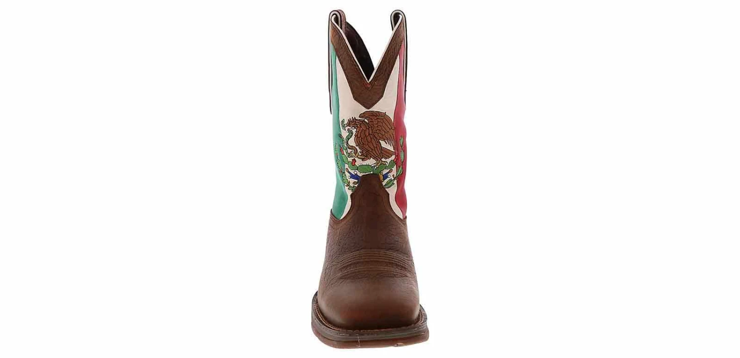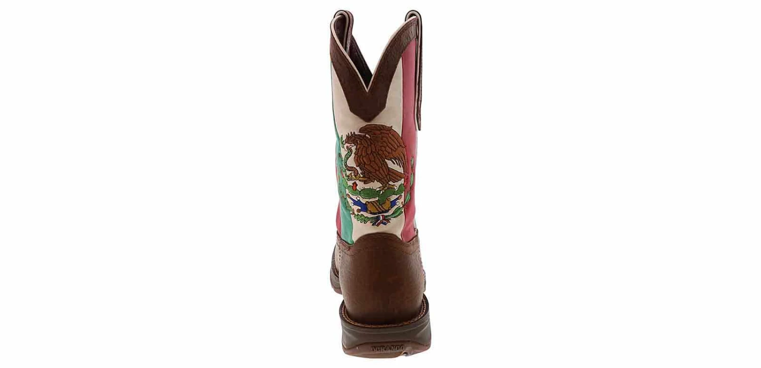 Show your pride with these Durango Rebel Mexico Flag Men’s Western Boot. The double-row welt stitching and square toe give these boots a traditional look.The Cushion Flex insole and ventilated cushion footbed will provide your feet with comfort that lasts all-day long. While the tempered steel shank supplies support to this rugged boot and gives you stable footing. The Durango Rebel Mexico Flag Men’s Western Boot heel is a low 1.5-inch, which allows you to have a steady stride.