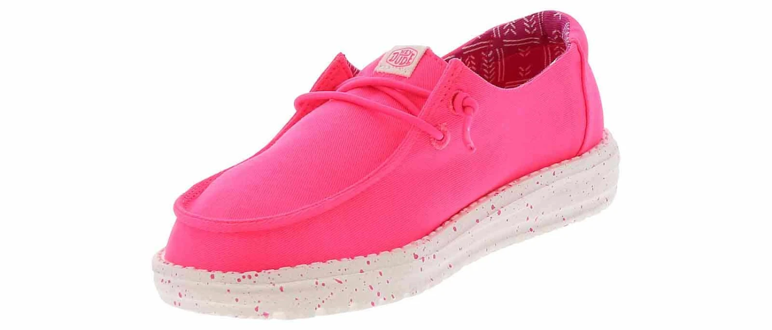 Step into a world of comfort and charm with this delightful HEYDUDE Wendy Canvas Youth (11-4) Casual Shoe! This pink solid patterned style features a convenient slip-on closure with customizable no-tie elastic laces. The cushioned insole and lightweight outsole make this platform shoe a comfortable choice. Spruce up your casual attire in style with the HEYDUDE Wendy Canvas Youth (11-4) Casual Shoe!