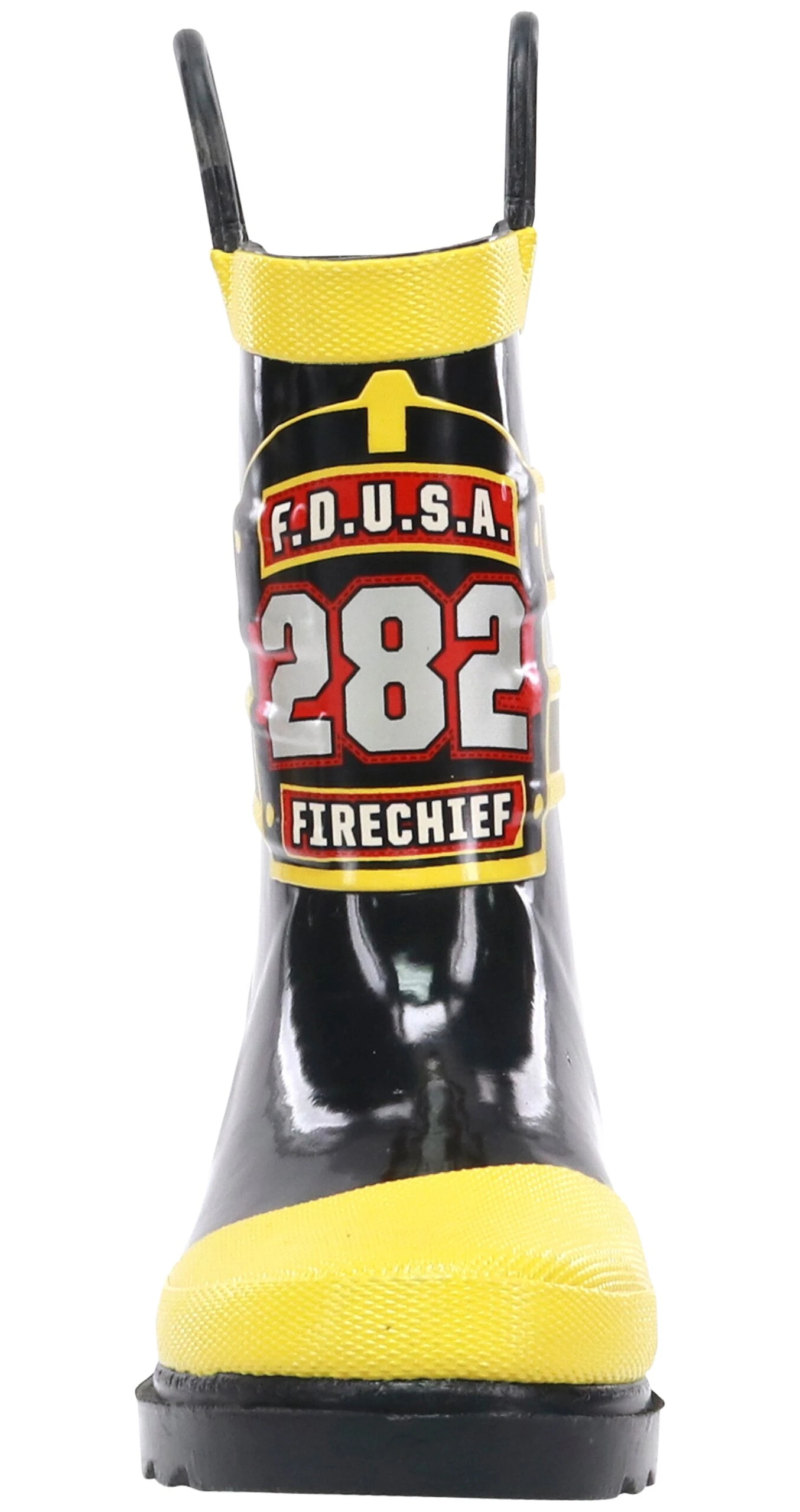 A Western Chief FDUSA Firechief Youth Boys’ Rain Boot is fun for outdoor puddle stompers. Easy pull-on handles make is quick and easy to get out the door when getting dressed. The cushioned insole adds padding to each of their steps, while the rubber outsole gives enhanced traction on slippery surfaces. Classic fireman boots that are favorite and will get worn again and again.