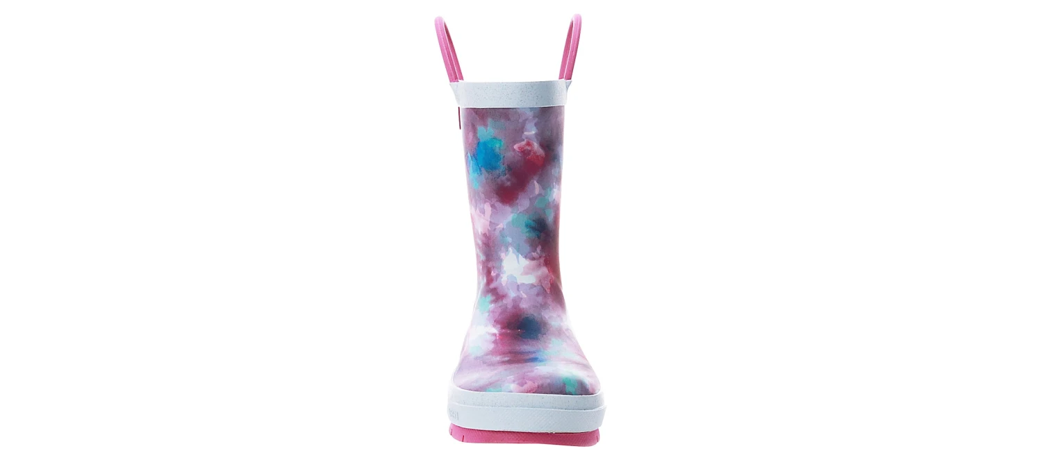 Western Chief Tie Dye Toddler Girls’ Rain Boots in pink, blue, and white. Matching pink outsole and looped handles. White glitter top and bottom trim help frame this boot nicely. Boots are easy to clean after a day of play. Easy pull-on handles make is quick and easy to get out the door when getting dressed. The cushioned insole adds padding to each of their steps, while the rubber outsole gives enhanced traction on slippery surfaces.